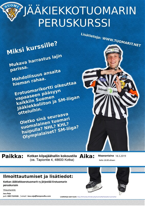 Oletko sinä seuraava suomalainen tuomari huipulla? Liiga? KHL? NHL? Olympialaiset? Oletko sinä seuraava suomalainen tuomari huipulla? Liiga? KHL? NHL? Olympialaiset? Haluatko osaksi Suomen suosituinta lajia? Haluatko sekä fyysisesti että henkisesti haastavan harrastuksen? Haluatko harrastuksen, jossa voit tienata taskurahaa liikkumalla ja ilmaisen sisäänpääsyn Liigan ja Suomen Jääkiekkoliiton alaisiin peleihin? Ilmoittautumiset ja lisätiedot: Jasu Raja puh. 040 732 4506