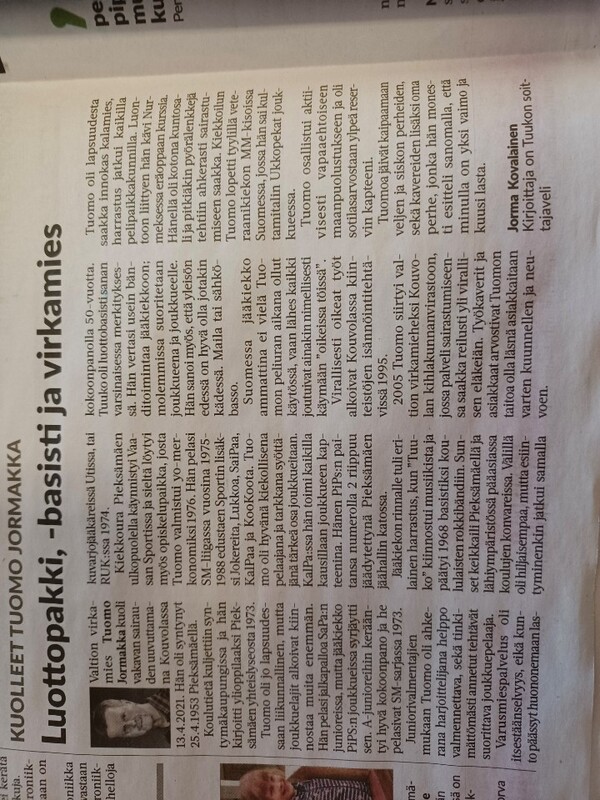 Titaaniperhe sai tiistaina suru-uutisen, kun tieto seuran toiminnassa 1980–1990 lukujen taitteessa tiiviisti mukana olleen Tuomo Jormakan kuolemasta tavoitti punanuttuyhteisön. Kuluva viikko eteläkymenlaaksolaisessa kiekkoelämässä sai erittäin surullisen käänteen, kun tieto Titaanien entisen seuratoimijan Tuomo Jormakan poismenosta tavoitti punanuttuperheen. Liitteet