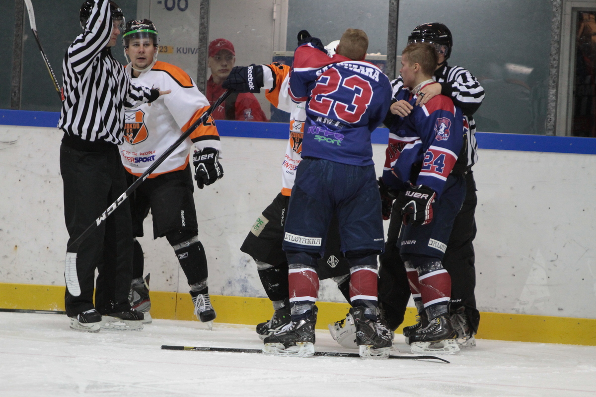 Täysin mitätön nokkapokka siniviivan tuntumassa sai ikävän päätöksen, kun mitä ilmeisimmin omasta mielestään vieraiden Joni Kettusen kaltoin kohtelemaksi joutunut Ville Hämäläinen tökkäsi selkeästi vihellyksen jälkeen KooKoo-65-hyökkääjää mailan päällä ylävartalon seudulle.