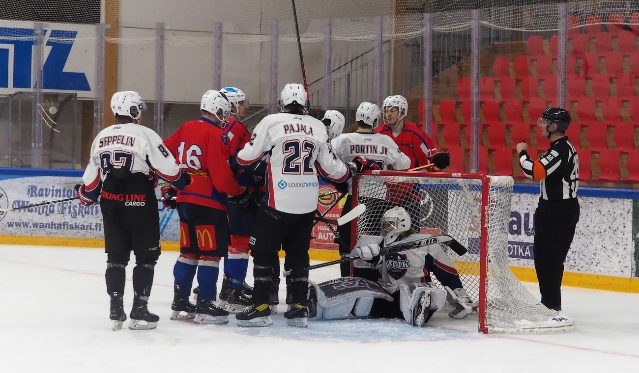 Titaanipelaajan hukattua hetkellisesti oman miehensä, pääsi jo avauserässä maaliverkkoa Niko Tammen selän takana heiluttanut Tobias Åkerman hiipimään kotkalaisveskarin eteen sekä ohjaamaan housunpuntillaan Linus Vesterlundin viivavedon verkkoon.