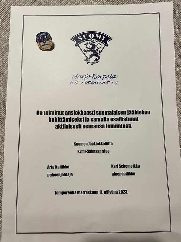 HK Titaanit ry:n osalta Kymi-Saimaan alueen ”Vuoden tekijä” –ansiomerkki vuosimallia 2023 myönnettiin Titaanien edustusjoukkueen kotiotteluiden lipunmyynnistä ja oheispalveluista vastaavalle sekä punanuttujen pelit niin ikään kuuluttavalle Marjo Korpelalle.