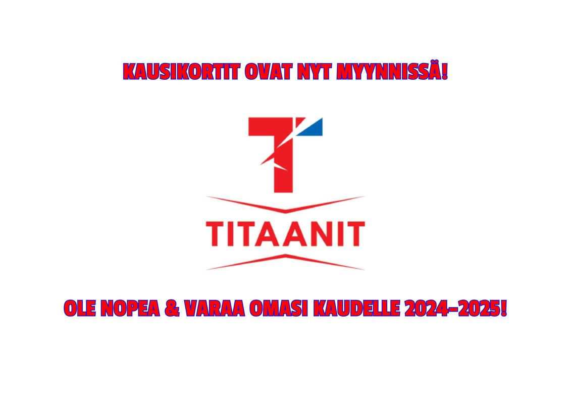 Titaanien kausikortit syyskuun puolivälin tietämillä alkavalle suomisarjakaudelle 2024–2025 kovat nyt myynnissä. Varaa kausikortti itsellesi ja varmista näin ajoissa paikkasi punanuttujen viihdyttävissä kotiotteluissa Kotkan jäähallin lehtereiltä!