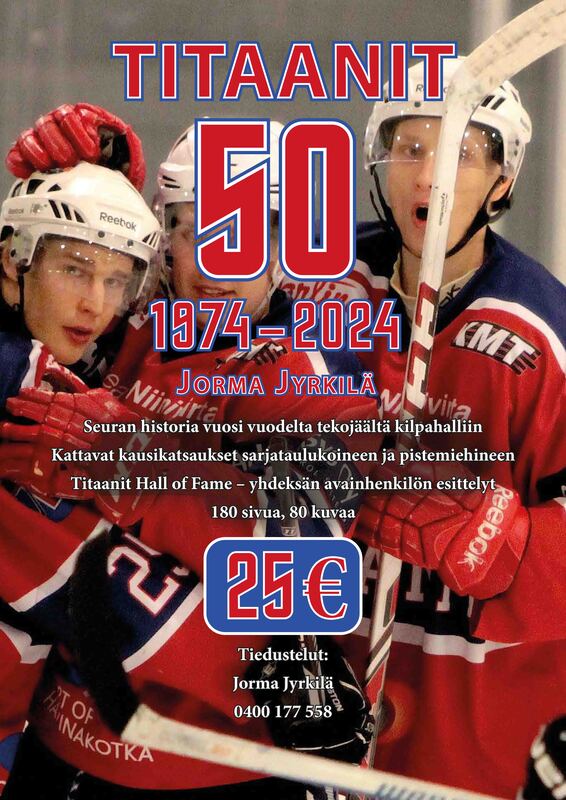 Titaanit 50 (1974–2024) -kirja julkaistaan ennen Suomi-sarjan runkosarjan avauskotiottelun Titaanit – SaPKo alkua, jonka jälkeen sitä voi ostaa punanuttujen fanimyyntipisteeltä itselleen 25 euron hintaan tai tilaamalla opuksen suoraan kirjailija Jyrkilältä (puh. +358 40 017 7558). TITAANIT – ETELÄKYMENLAAKSOLAISTA JÄÄKIEKKOILUA 50 VUOTTA!