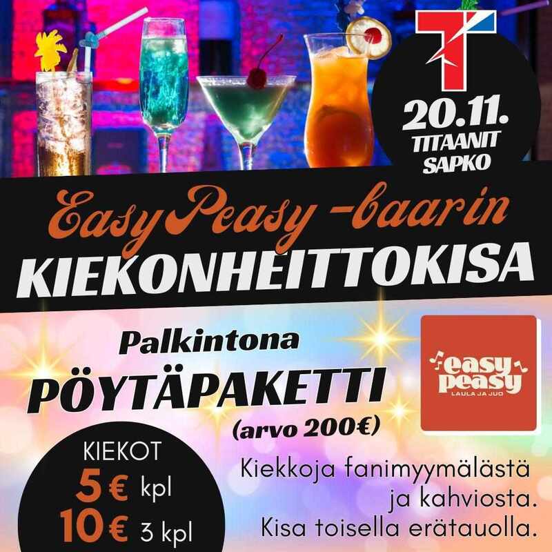 Ottelun toisella erätauolla järjestetään Kiekonheittokilpailu, jossa lähimmäksi kaukalon keskipistettä kumimuikun viskaisevalle on tarjolla EasyPeasy-baarin tarjoama 200 euron arvoinen pöytäpaketti – kiekkoja on pelin aikana myynnissä Kotkan jäähallin sisääntuloaulassa sijaitsevissa Titaanien fanimyymälässä sekä kahviossa!