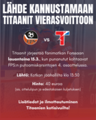 Titaanit järjestää lauantaina 15.3.2025 fanimatkan Forssan jäähallissa kello 17:00 alkaen pelattavaan Suomi-sarjan putoamiskarsintojen 4. osaotteluun FPS–Titaanit.