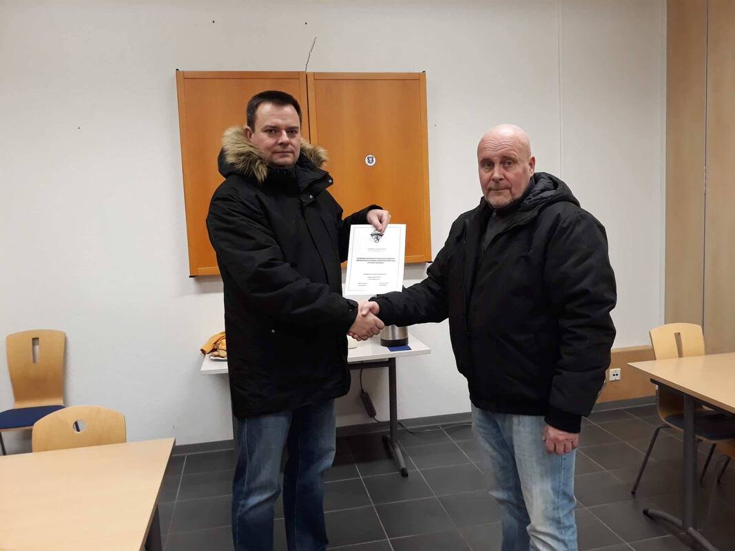 ”Vuoden tekijä” –ansiomerkin ja kunniakirjan Kimmo Siiskoselle (oik.) luovutti Kymi-Saimaan alueen aluehallituksen jäsen Kimmo Salonaho.